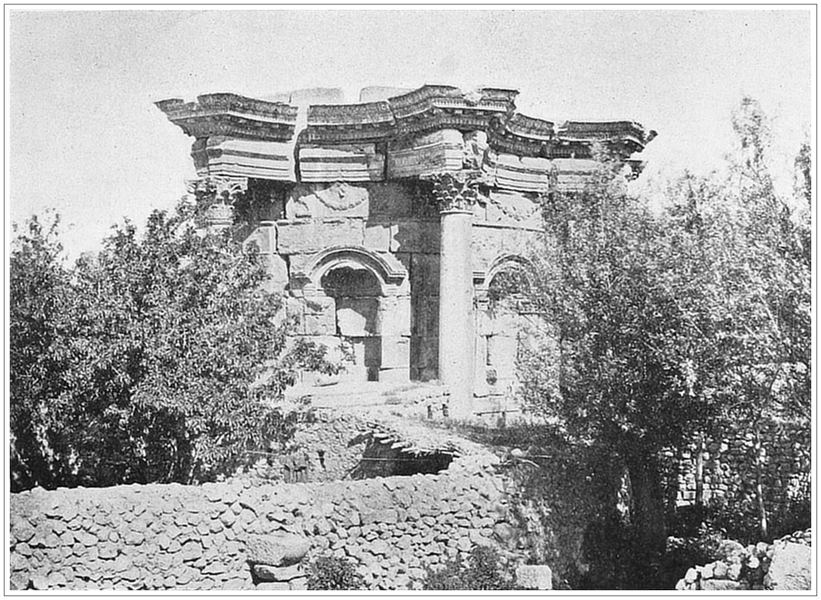 RUINS OF BAALBEK, SYRIA. Baalbek,—the city of Baal or the Sun, the Heliopolis of the Greeks, once famous as the most magnificent of Syrian cities, which passed successively under the rule of the Persians, Greeks and Romans, was plundered by the Arabs in A. D. 639, by the Christians and others during the Crusades, and was finally sacked and dismantled by the Tartars, under Tamerlane.—Baalbek to-day exists only as a mass of ruins; but its very ruins are of the utmost magnificence. The most imposing are the remains of the Great Temple. But the most beautiful is the Circular Temple—a semi-circular cella surrounded on the outside by eight Corinthian columns. Within there is a double tier of smaller pillars, the lower row being Ionic and the upper Corinthian. In modern times, and, indeed, up to the present century, this was used as a Greek church, but it is now deserted and choked with débris.