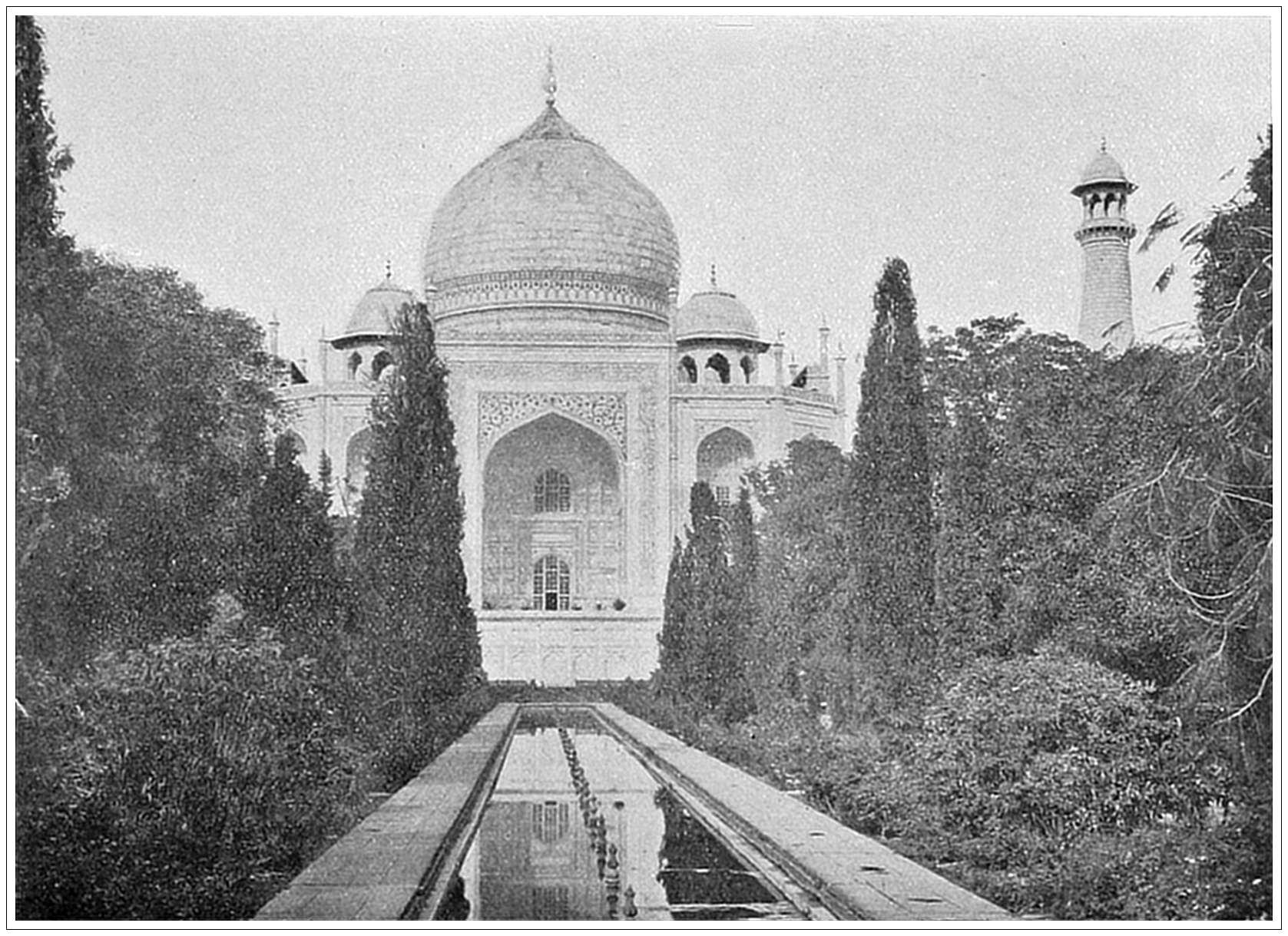 TAJ MAHAL, AGRA, HINDOSTAN. This magnificent mausoleum is the glory of Indo-Mussulman architecture. It was built by the Emperor Shah Jehan for himself and his favorite wife, Nourmahal, who died in child-birth in 1629. For twenty-two years twenty thousand men were employed in its construction, the total cost reaching $16,000,000. Built of white marble, it forms a quadrangle of one hundred and ninety square yards, surmounted by a lofty dome, with smaller domes at each corner and four graceful minarets one hundred and thirty-three feet high. The great central hall is paved with squares of various-colored marbles, while the walls, tombs and screens are ornamented by exquisite mosaic work. The elegance and delicacy of the design and the elaborate perfection in every detail of the workmanship are alike marvelous. It seems almost like a castle built in a dream, a fabric of mist and sunbeams, which would dissolve at a touch. Yet it has resisted the encroachments of time and the barbarian despoiler, and has come down to our day almost perfect.