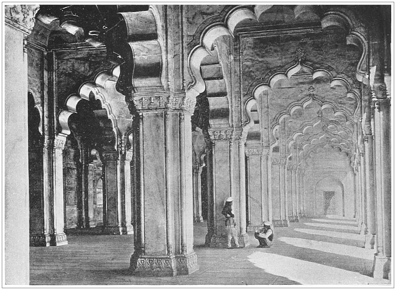 PEARL MOSQUE, AGRA, HINDOSTAN. The very name of the building is a tribute to its beauty. It is undoubtedly the most elegant mosque of Indian-Mahometan architecture. Although it gives the general impression of lightness, grace, delicacy, it is by no means a small building. Externally it is two hundred and thirty-five feet east and west by one hundred and ninety feet north and south. The court yard is one hundred and fifty-five feet square. The mass is also considerable, as the whole is raised on a terrace of artificial construction, by the aid of which it stands well out from the surrounding buildings. Its chief beauty consists in its court yard, which is wholly of white marble from the pavement to the summit of its domes. The interior is a bewildering maze of columns of exquisite proportions.