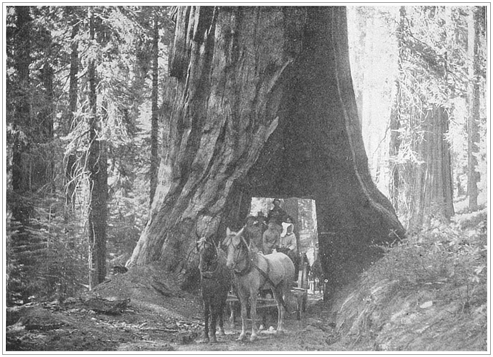 BIG TREES, CALIFORNIA. Rigid scientists call these trees Sequoia gigantea. In England they are sometimes known as Wellingtonia, in America as Washingtonia. But the pride of science and of patriotism have had to bow to the will of the populace, which has been satisfied with the simpler and therefore more energetic title of Big Trees. They are confined to the western portion of the California range, occurring in detached groups or groves at an altitude of from four thousand to five thousand feet above the sea. Some of these vast vegetable columns are upwards of thirty feet in diameter, and from three to four hundred feet in height. One of the trees in the Mariposa Grove, represented in the accompanying engraving—some twenty-five feet in diameter—stands directly arching the roadway, and a miniature tunnel has been cut through it which admits of the passage of a four-horse stage coach.