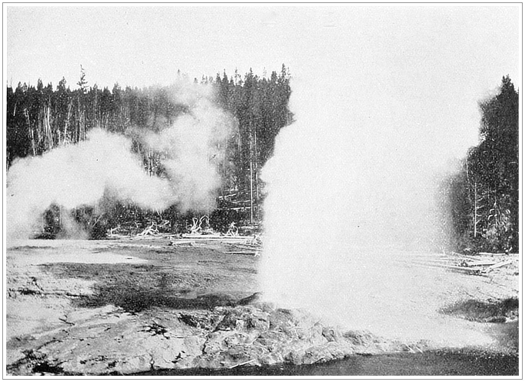 GEYSERS, YELLOWSTONE PARK, WYOMING. The Geyser region in the Yellowstone occupies some thirty square miles. Within this comparatively limited area is a most stupendous exhibition of hot springs, water geysers, mud geysers and steaming caldrons of boiling water. No two of the geysers are alike. The Grotto simply churns and makes a great noise. The others go off at various intervals; some every hour, some all the time and some once a month; some on alternate days, yet the day they are active going over ninety minutes. Nor is their style of action the same. Some play with labored pumping, others throw an unbroken stream; some wear themselves out in a continuous effort, others subside only to recommence again repeatedly. An eruption may extend from two to twenty minutes, the approximate time occupied by the Grand, or even to one hour and twenty minutes, a period that the Giant has been timed to play. The Grand is the largest geyser in the world, shooting a vast column of water over two hundred feet into the air.