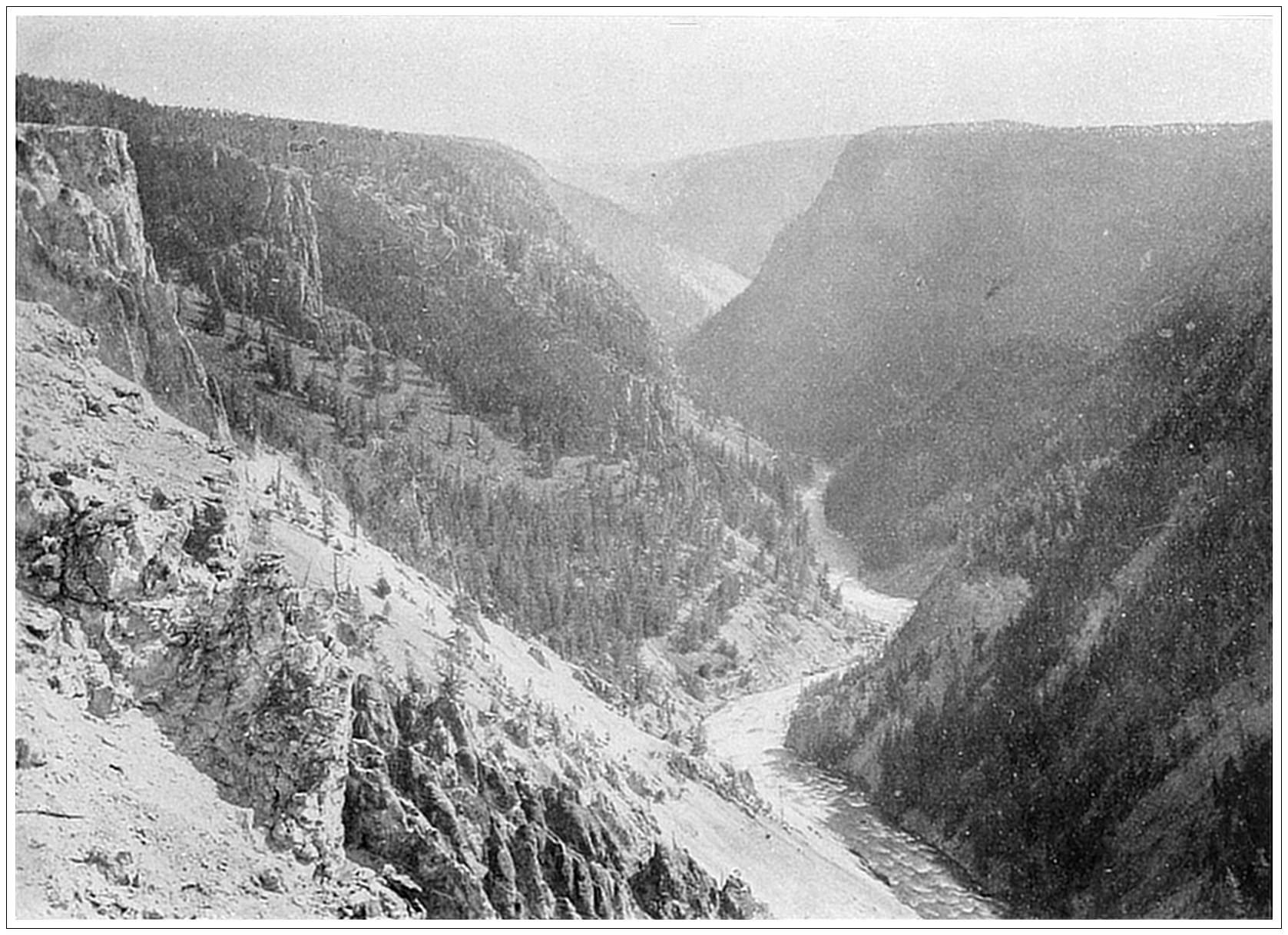 GRAND CANON, YELLOWSTONE PARK. The Yellowstone Park is one of the great natural marvels of the world. Within a compass of one hundred square miles there are here gathered the loveliest valleys, the grandest canons, the most marvelous mountains, lakes, rivers, springs and cascades. In addition there are all sorts of natural phenomena: Sulphur mountains, a mud volcano, petrified forests and over ten thousand active geysers, hot springs, salfataras and boiling pools. Greatest of all the sights is the Grand Canon, a ravine varying in depth from one thousand to two thousand feet. The shelving sides of precipitous crags slope down, presenting an endless variety of form and color, until they meet at the bed of the Yellowstone River, which flings itself impetuously along to meet the lake. “A great gulch let down into the eternities,” such is the opinion of De Witt Talmage on this miracle of nature.