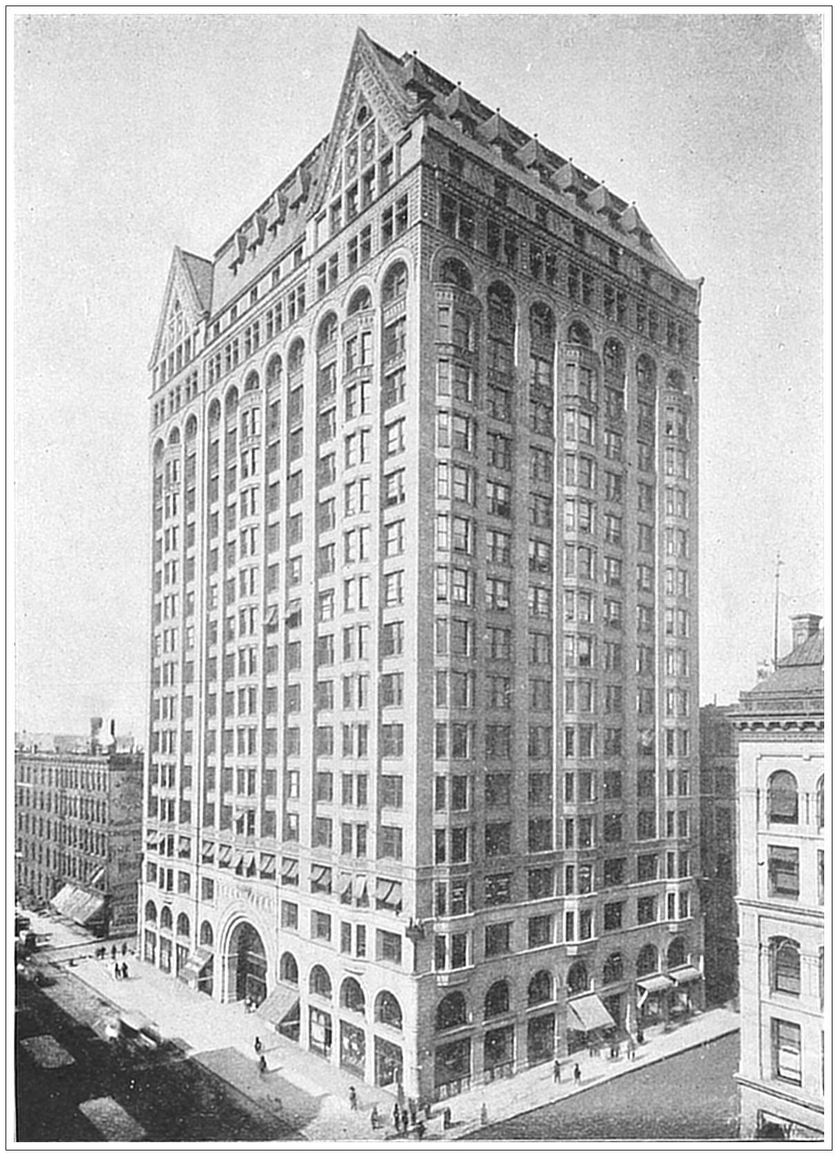 MASONIC TEMPLE, CHICAGO. For a long time it was held that Philadelphia had the finest Masonic Temple in the world. Now that honor belongs to Chicago. But it has only belonged to it since 1890, when the gorgeous new building was begun at the corner of State and Randolph Streets. The site measures one hundred and seventy feet on State Street and by one hundred and fourteen on Randolph. Every inch of this space is covered by the building, whose twenty stories tower up to the height of two hundred and sixty-five feet. It rests on cement and iron foundations, and its superstructure is of steel. The first three stories are faced with red granite from Wisconsin, the remainder with gray brick that is indistinguishable from the granite. An immense granite arch in the centre of the State Street front forms the entrance, and opens into an interior court, faced from bottom to top with different colored marble. The first eleven stories are fitted up for shops, from the eleventh to the sixteenth inclusive are business offices, while above the sixteenth floor everything is devoted to Masonry.