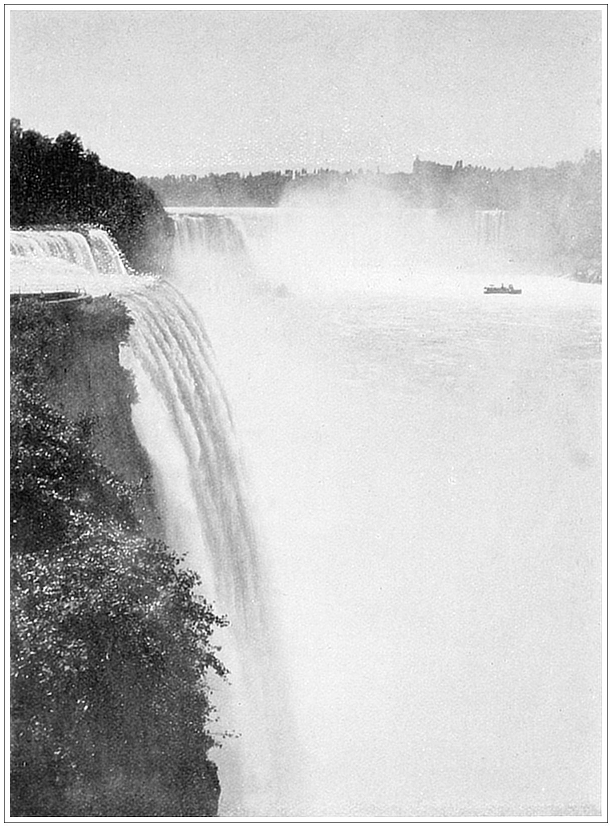 NIAGARA FALLS. The most stupendous cataract in the world is that formed in the Niagara River, four miles below Grand Island. Here the current begins to grow narrow and develops into rapids, which continue for about a mile, with a descent of fifty-two feet, until the river plunges over a mighty chasm. Goat Island, at the very verge of the cataract, divides it into two sheets of water—the Horse-shoe, or Canadian fall, with a descent of one hundred and fifty-eight feet, and a width of about twenty-six hundred and forty; and the American fall, one hundred and sixty-two to one hundred and sixty-nine feet deep, and about one thousand wide. The volume of water thus precipitated is about fifteen million cubic feet a minute. Nearly nine-tenths of this passes over the Canadian fall. For some distance below the Falls there is still water, the mass which has hurled itself into the abyss sinking and only reappearing two miles below, where the whirlpool rapids begin.