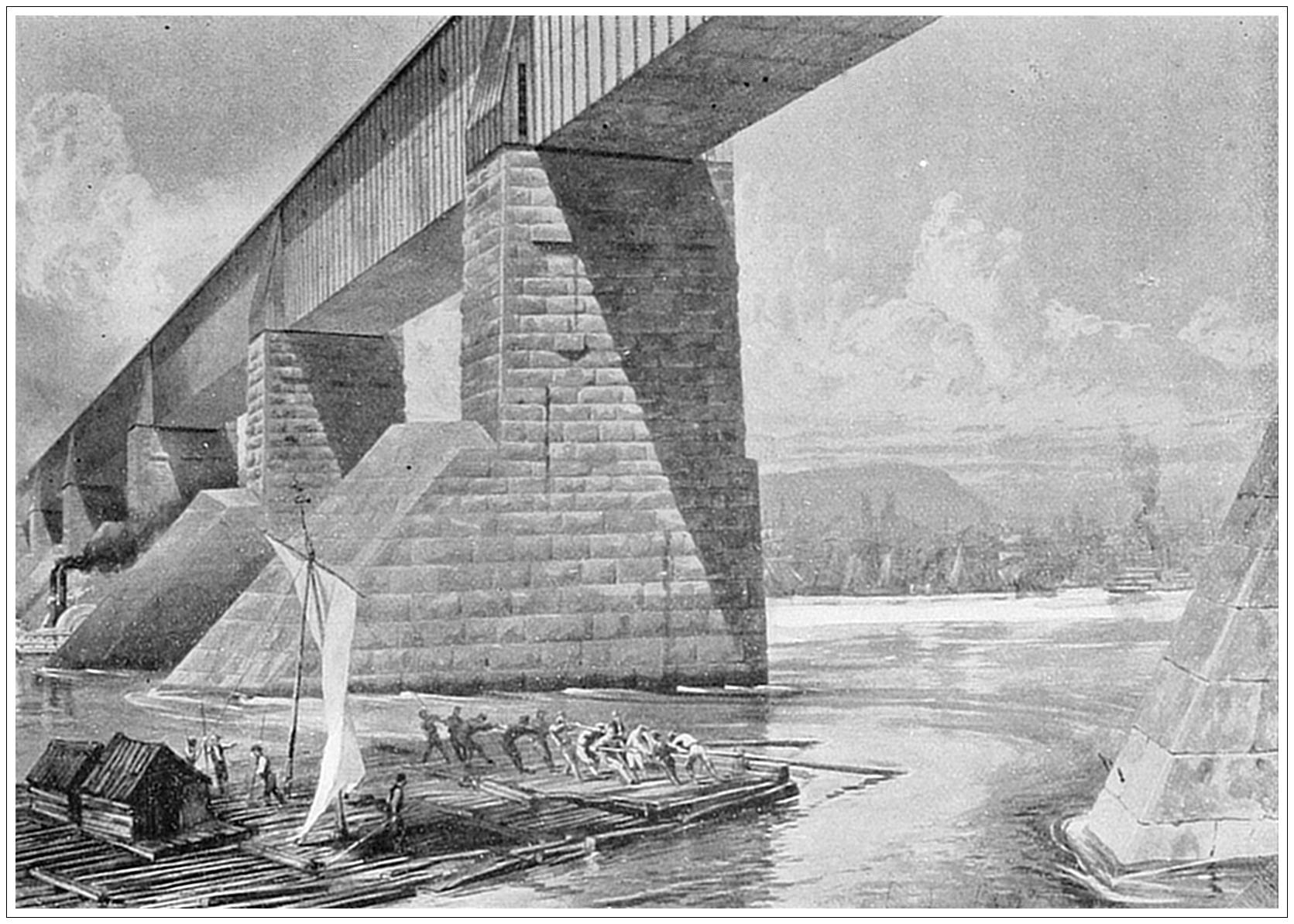 VICTORIA BRIDGE, MONTREAL, CANADA. Montreal is situated on the south side of the island of the same name, at the confluence of the Ottawa and the St. Lawrence Rivers. To connect it with the mainland the Victoria Bridge was thrown across the St. Lawrence. Work was begun in 1854. In 1860 the bridge was formally opened by the Prince of Wales during his tour through Canada and the United States. This is one of the greatest triumphs of engineering and architectural skill. The total length is nearly two miles, or, to be exact, nine thousand one hundred and ninety-four feet. It rests upon twenty-four piers and two abutments of solid masonry. The central span is three hundred and thirty feet long.