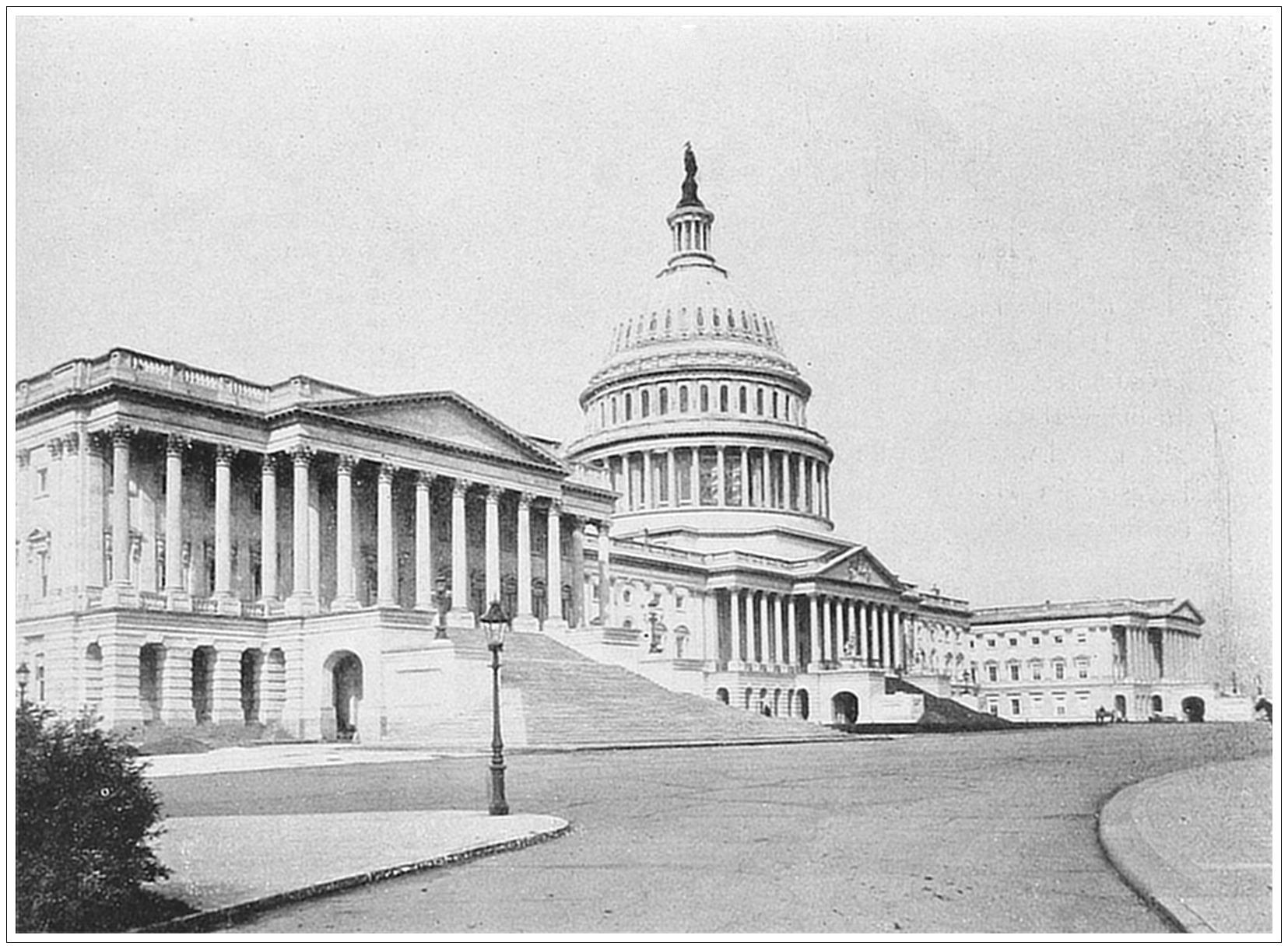 THE CAPITOL, WASHINGTON, D. C. A stately and magnificent building devoted to both branches of Congress—the Senate and the House of Representatives—as well as to the United States Supreme Court and the Library of Congress. It stands upon an eminence commanding a beautiful view of the city, and itself forms the most impressive feature in the landscape. The centre building of freestone is flanked by two wings, mainly of marble, and crowned by an iron dome, painted white. From the ground to the top of the nineteen-foot Statue of Liberty, which surmounts the dome, is three hundred and seven and a half feet; the diameter of the dome is one hundred and thirty-five and a half feet. Thus only four domes in Europe can surpass it: St. Peter’s at Rome, St. Paul’s in London, St. Isaac’s in St. Petersburg, and the Invalides in Paris. The building covers an area of about three and a half acres. Its total cost has been over $13,000,000. The corner-stone was laid by Washington in 1792. The marble extensions were begun in 1851.