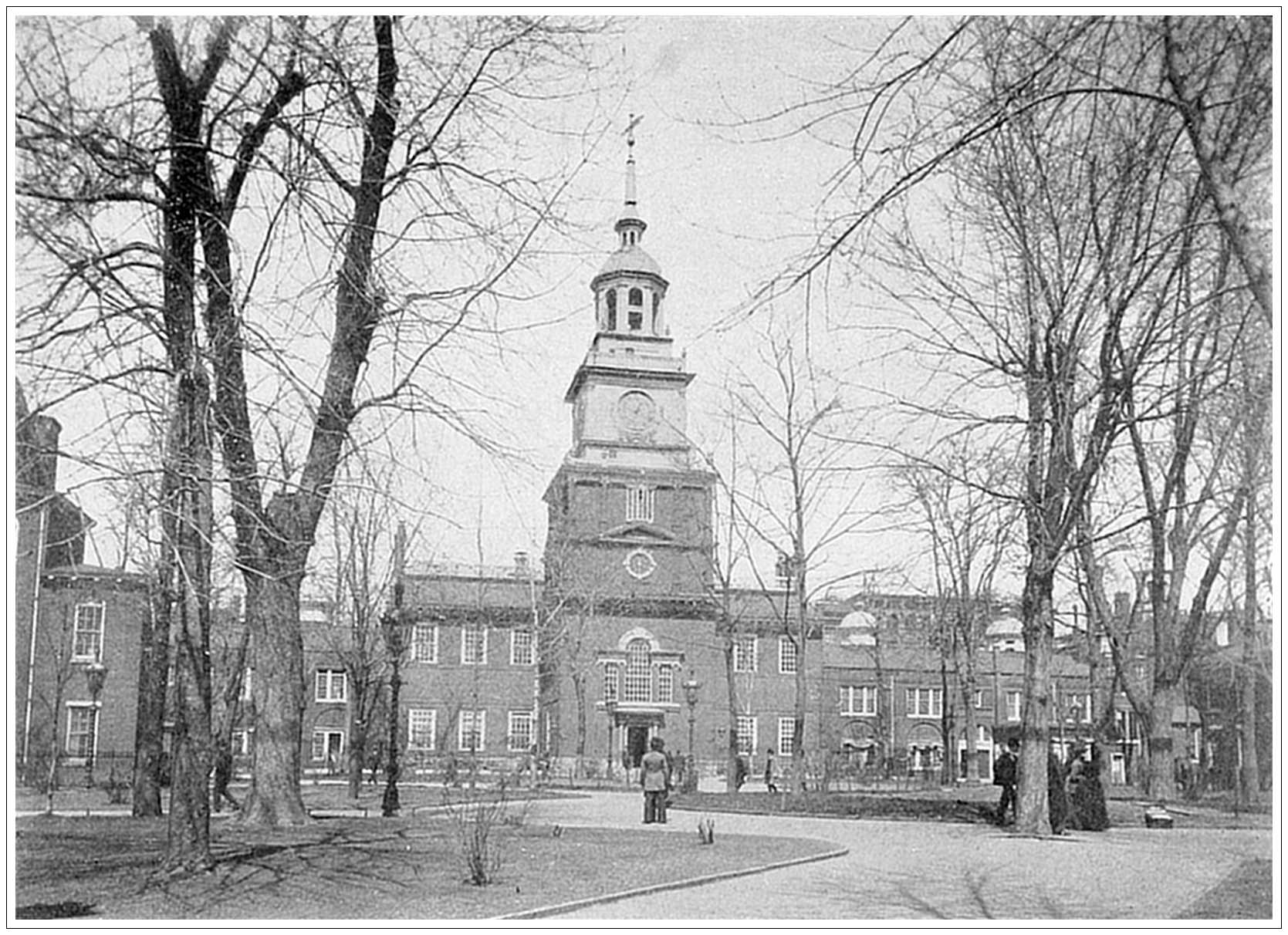 INDEPENDENCE HALL, PHILADELPHIA. This plain, but substantial brick building, which stands on Chestnut Street, Philadelphia, is ever memorable as the birthplace of the American republic. Here the General Assembly of Pennsylvania gave way to the Continental Congress. Here George Washington was elected commander of the American forces (June, 1775). And here, on July 4th, 1776, the Declaration of Independence was adopted by Congress. Four days later it was read from before the building to an excited and exultant multitude. The halls have been restored as far as possible to their original condition; the east room, where the Declaration was signed, is ornamented with portraits of the signers and the west room is a museum of revolutionary and other relics. The famous Liberty Bell, which was rung as a signal to the people that the Declaration had been adopted, is now suspended under the tower in full view of the public. The building dates from 1729–34.