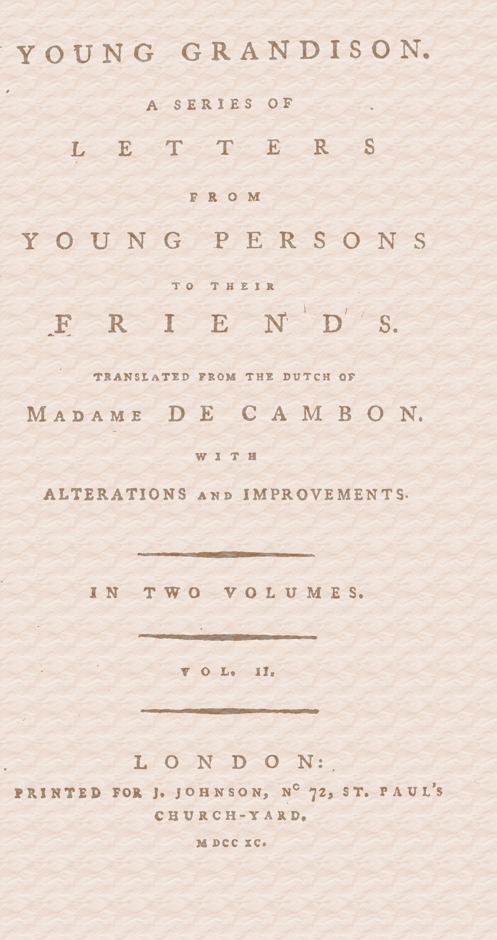 I wish to inform you, my dear Grandison, what joy I felt when I returned back again to a dearly loved mother.—But, no;—you who love your parents so tenderly, can easily imagine what I cannot describe. How full of transport was the moment, when, after a year’s absence, I again embraced the dear guardian of my youth. It was very early in the morning when we entered 2the city; my mother, as we had not had a fair wind, did not expect me, and of course was in bed. My first eager desire made me ascend the stairs; but as I was hastening to her bedchamber I recollected myself, and returned softly back. It is still dark, thought I, shall I disturb her repose, by my sudden appearance at her bedside? Certainly not. That would be mistaken love, mere selfish affection. You will, I think, approve of this prudence. Mean while I was full of impatience: a thousand times I wished her to wake, counted the minutes, and listened continually.—At length the moment arrived; my heart beat quick; I almost flew up the stairs; but again I stopped myself, and resting on the last stair, I called out, Here is your own William, dear mother, may I come in? Was I not right, my friend? for the sudden surprise of seeing me, would have been too much for her 3spirits. Before I could well hear her answer my patience was exhausted, and I rushed in, and was at her bedside out of breath; I could only say, My dear mother. She pressed me to her bosom, crying, My William, my son!—and we both wept together: but they were delightful tears: I never in my life experienced so much heart-felt satisfaction.