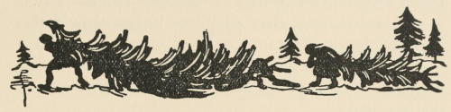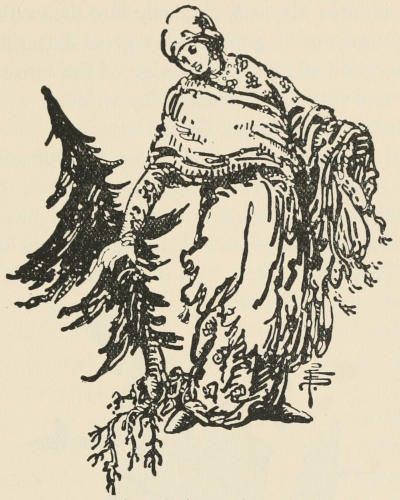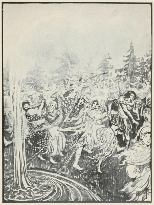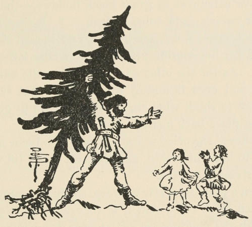 Just as the fun was at its liveliest, there was a mighty gurgle, and the fountain, which had been casting itself[14] so high into the air, sank suddenly into the earth. The oldest giantess of all gathered her great fluttering robes about her, and striding to the edge of the forest, pulled up a fir-tree with one wrench of her wrist.