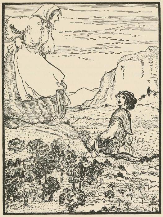 The giant beamed. “That feels better,” he said. “And now, little herdboy, I will show you how a giant keeps his word. If you are not afraid to sit upon my shoulder, I will take you where no little creature has ever been: to see a giants’ merrymaking. We are holding a wedding-feast now, and there will be plenty of fun, you may be sure. Come, I will take good care of you.”