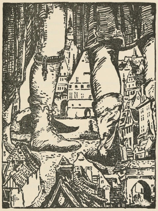 “Now you’re quite safe and steady, little boy,” he said. “Don’t be afraid, but lean back against me, and look about.” And with that he took a high step over a whole block of houses into an open square beyond.