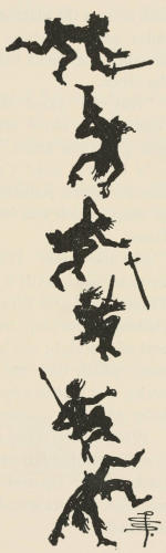 Instantly the giants seemed to flatten out. Their backs seemed to come forward, and their fronts to shrink back. Their arms, their legs, their heads, their bodies,[15] grew thin as cardboard. They stood there like great paper-dolls, taller than the trees. One by one, they stepped into the hole where the tree had been, and cut their way down into the ground like huge knives.