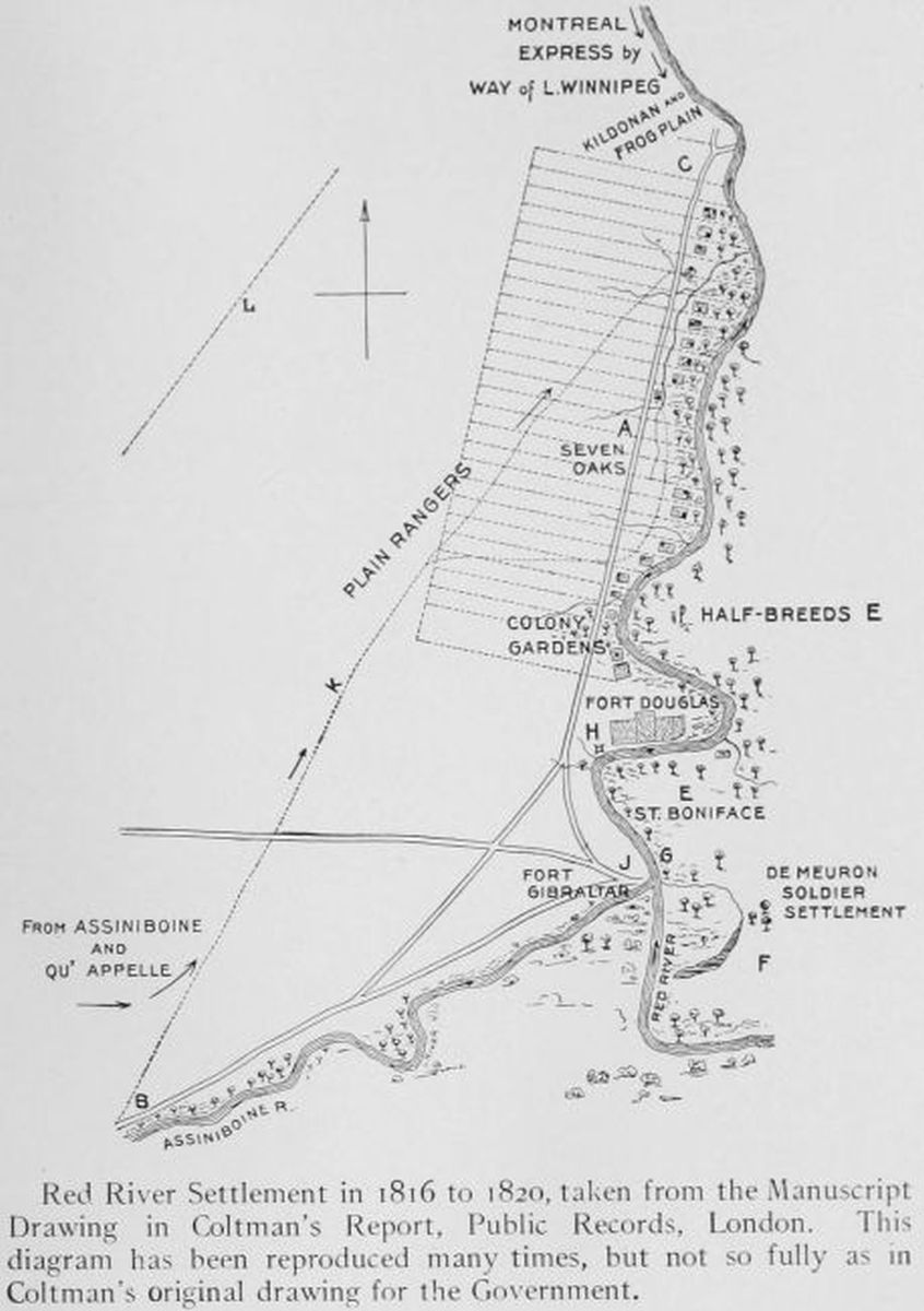 The union of Nor’Wester and Hudson’s Bay had thrown many old employés out of work. These now retired to Red River, where they were granted one hundred acres of land and paid a few shillings an acre for another twenty-eight acres, making up farms of one hundred and twenty-eight acres, all facing the river and running back in long, narrow lots to the highway now known as St. John’s Road. St. John’s and Kildonan expanded to St. Paul’s and St. Andrew’s[388] settlements northward. Across the river were three sets of settlers—the French Plain Rangers, descendants of the old Nor’Westers, the De Meuron soldiers, and the Swiss. These gradually clustered round the settlement just opposite the Assiniboine, where the Catholic missionaries were building chapel and school, and the place became known as St. Boniface, after the patron saint of the Germans. In the old buildings of Fort Douglas lived the colony governor distinct from the Company governor, Sir George Simpson, whose habitat was Fort Garry, near the site of old Fort Gibraltar, when he was in the West, and Lachine, at Montreal, when he was in the East.