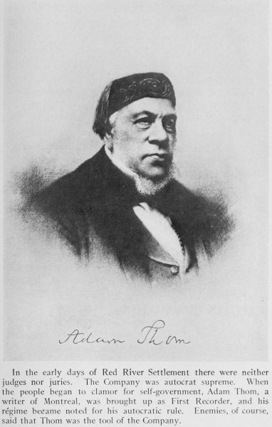 In the early days of Red River Settlement there were neither judges nor juries. The Company was autocrat supreme. When the people began to clamor for self-government, Adam Thom, a writer of Montreal, was brought up as First Recorder, and his régime became noted for his autocratic rule. Enemies, of course, said that Thom was the tool of the Company.