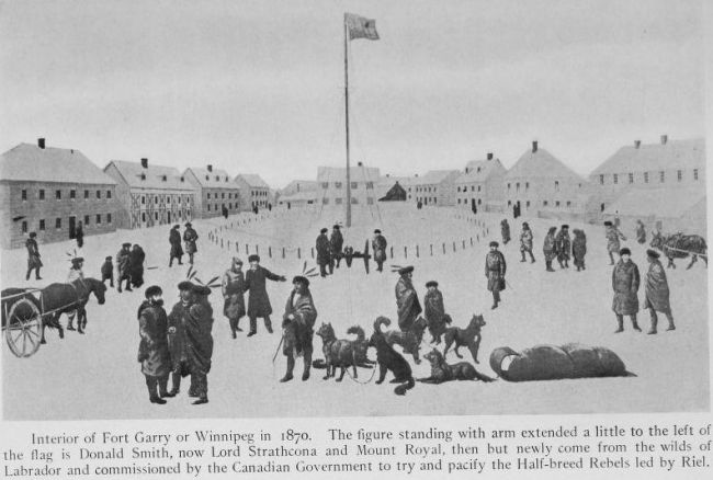 Interior of Fort Garry or Winnipeg in 1870. The figure standing with arm extended a little to the left of the flag is Donald Smith, now Lord Strathcona and Mount Royal, then but newly come from the wilds of Labrador and commissioned by the Canadian Government to try and pacify the Half-breed Rebels led by Riel.