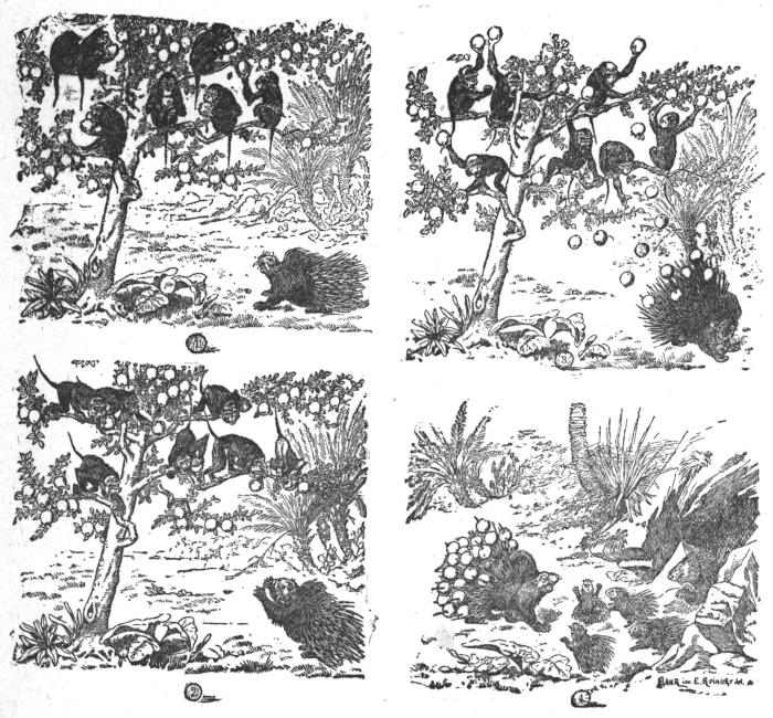 One day Father Porcupine was out hunting food. He came to a tree in which sat a lot of monkeys eating oranges. He asked for some, but the unkind monkeys only pelted him with the fruit as hard as they could! Then Father Porcupine laughed and put up his quills, and the oranges stuck on them. When his quills were stuck full he started for home, and he and his family had a fine dinner.
