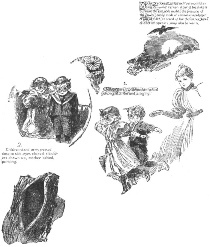 Mother recites or sings each verse; children sing tu-whit refrain. A pair of big disks to surround the eyes adds much to the pleasure of the “owls”, easily made of common crimped paper. A pair of tufts, to stand up like the feather “horns” of certain species, may also be worn.