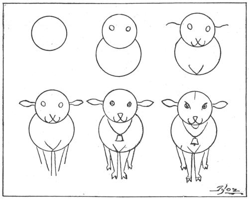 Draw two circles, a small one at the top, a large one below and behind it, as in the first two designs. Draw around a small cent and a large copper cent (or two-cent piece, or silver quarter). Add two tiny circles for eyes, then the lines in the following designs, and finally you will have a spring lamb with a tinkling bell.