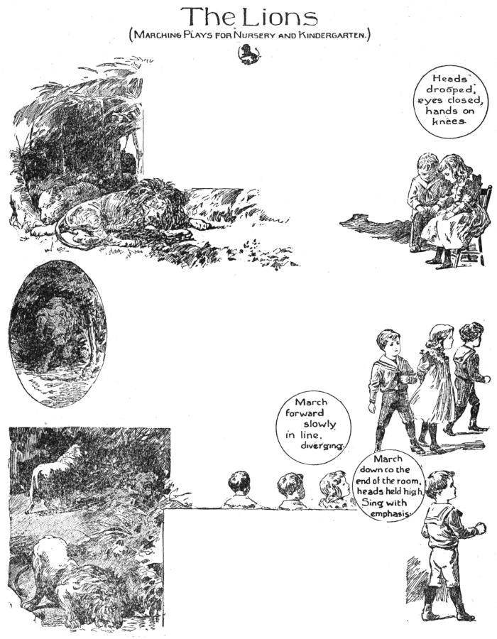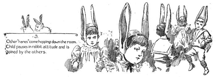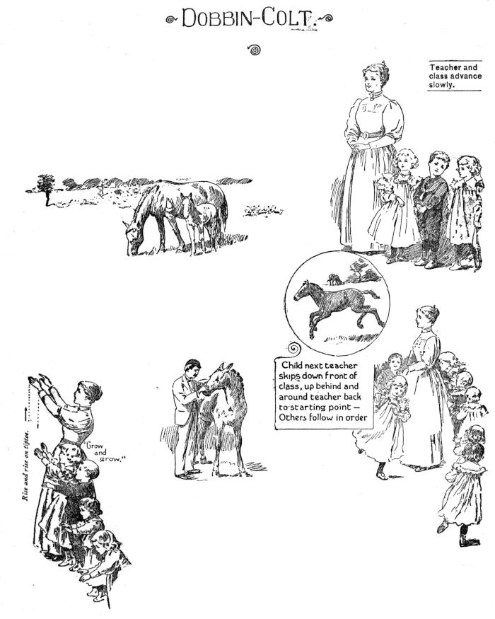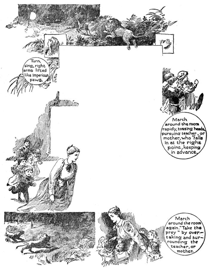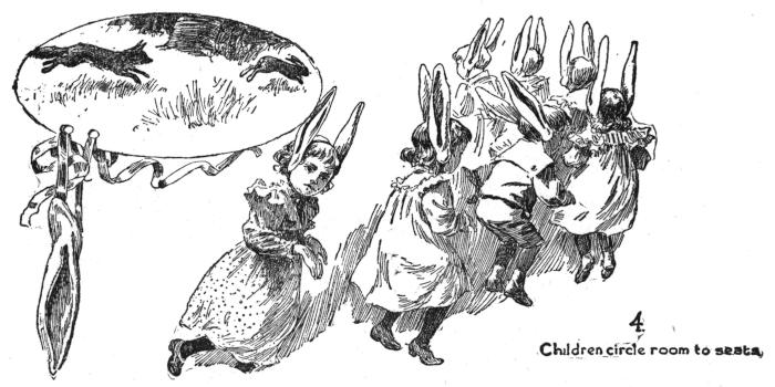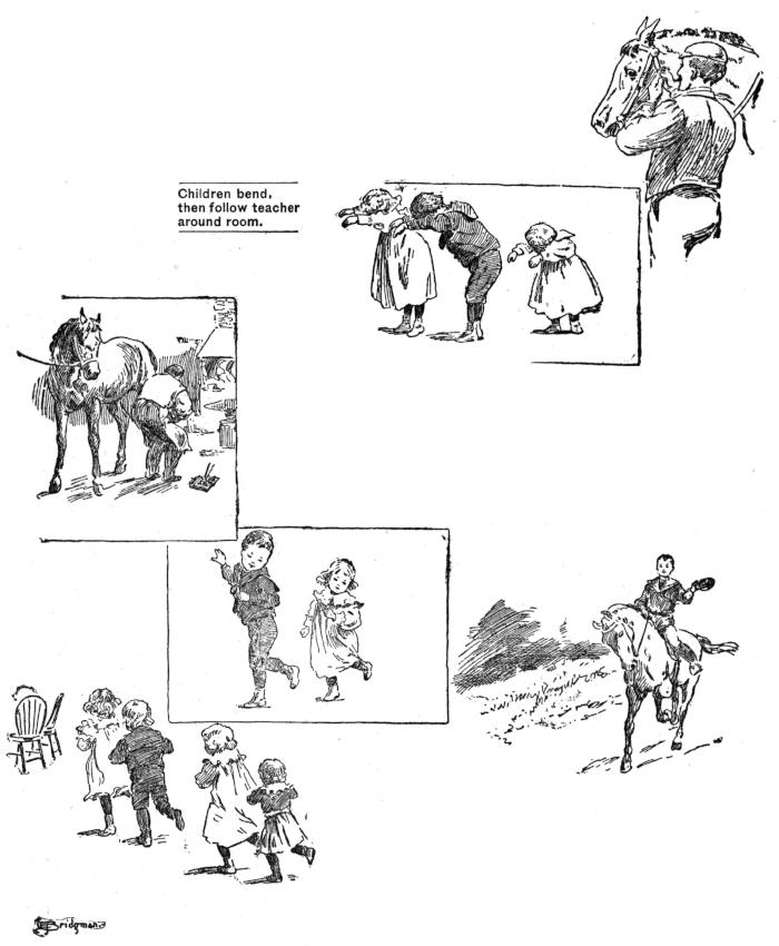 March around the room rapidly, tossing heads, pursuing teacher, or mother, who “falls in” at the right point, keeping in advance.
