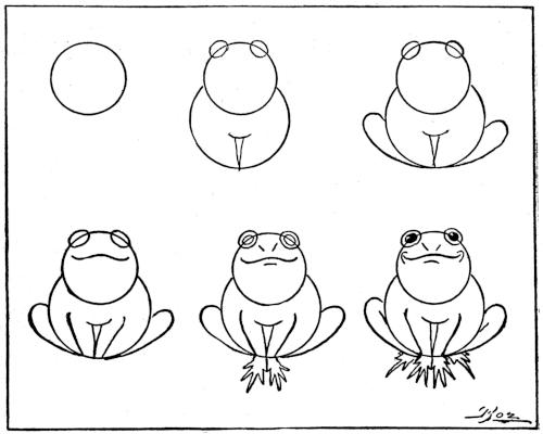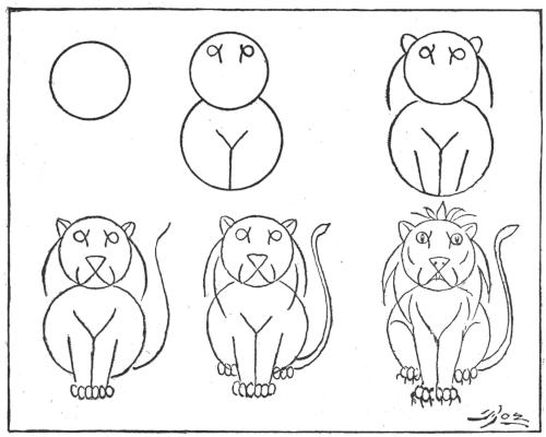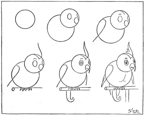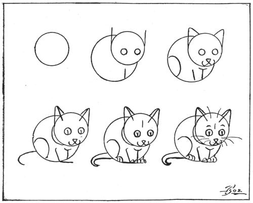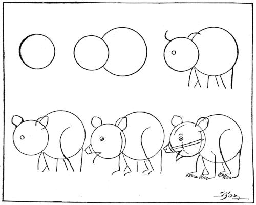 Draw a small circle, and then a large circle at the right of, and behind, the other—as in the first and second designs. (Use a small cent and a large copper cent, or two-cent piece, or silver quarter.) Then add the lines in the third, fourth, fifth and sixth designs—and you will have a very tame bear wearing a muzzle.