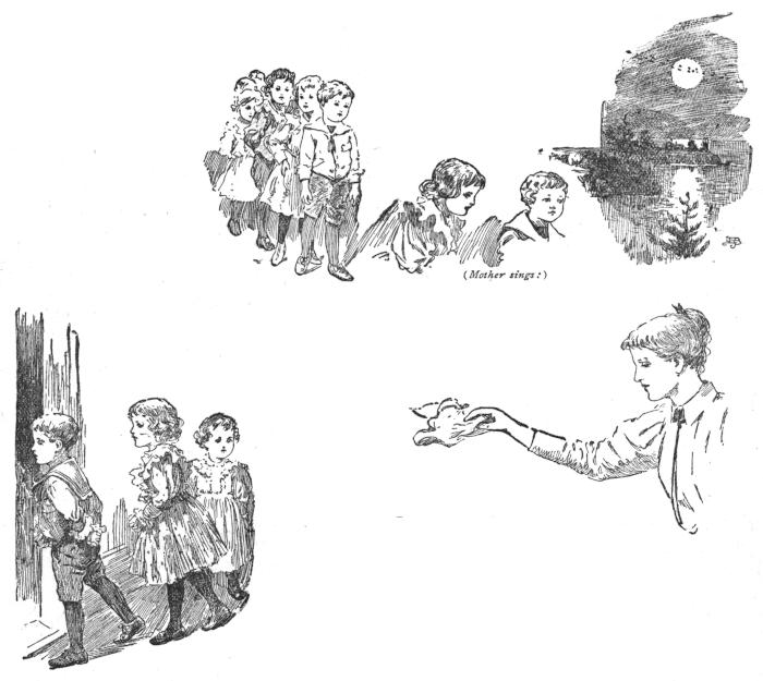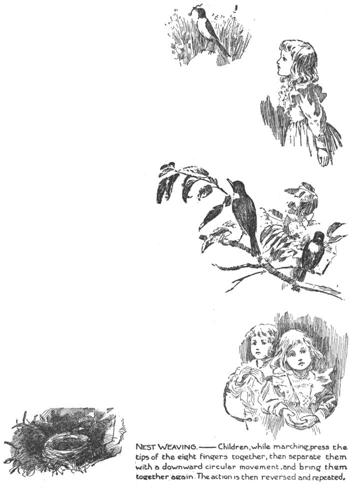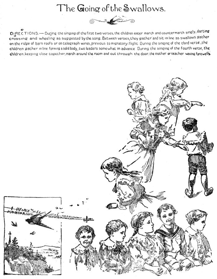 DIRECTIONS.—During the singing of the first two verses, the children enter march and countermarch singly, darting crossing and wheeling as suggested by the song. Between verses, they gather and sit in line as swallows gather on the ridge of barn roofs or on telegraph wires, previous to migratory flight. During the singing of the third verse, the children gather in line forming a solid body, two leaders somewhat in advance. During the singing of the fourth verse, the children, keeping close together, march around the room and out through the door, the mother or teacher waving farewells.