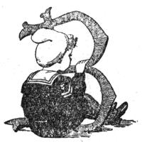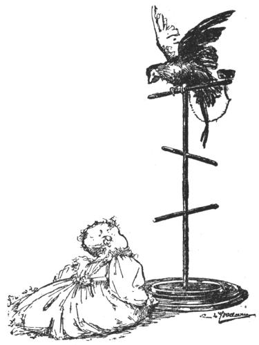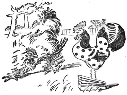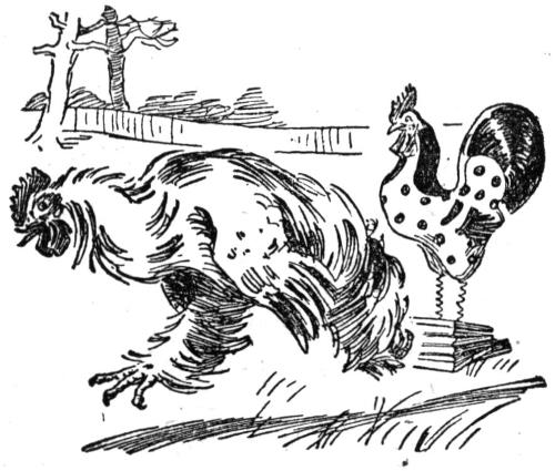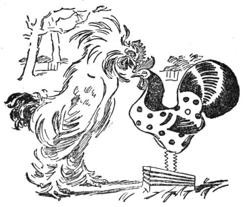 Soon after sunrise the White Brahma cock came out for a walk, and his eye fell on the stranger. “What’s this?” said he, drawing back. He noticed the gold spots on the stranger’s breast, and his curling green and blue tail feathers, and his wrath rose. “I’ll curl his impudent feathers!” said he, and flew at him prepared to tear his comb out by the roots. The stranger did not show fight and was borne down, yet began to crow, and gave out such a string of victorious cock-a-doodles that the White Brahma turned and ran for his life. He did not know what Baby knew—that if you bore the rooster-toy down hard he would cock-a-doodle six times running.