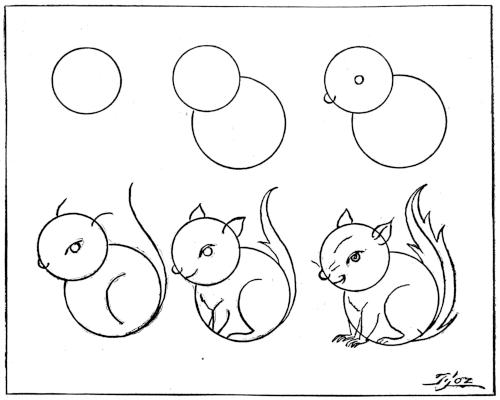 First, find two pennies, one small, one large (or, if a big old-fashioned copper cent is not to be found in papa’s pocket, a two-cent piece, or a silver quarter, will do as well). Then take slate, or paper, and pencil, and draw a small circle and a large circle, as in the first and second pictures. To these lapping circles, add eye, nose, mouth, ears, legs, feet, and last of all a fine bushy tail—and, behold! the nimble pennies have changed to a gay little Christmas “nut-cracker”—which everybody knows is one of the squirrel’s nicknames.