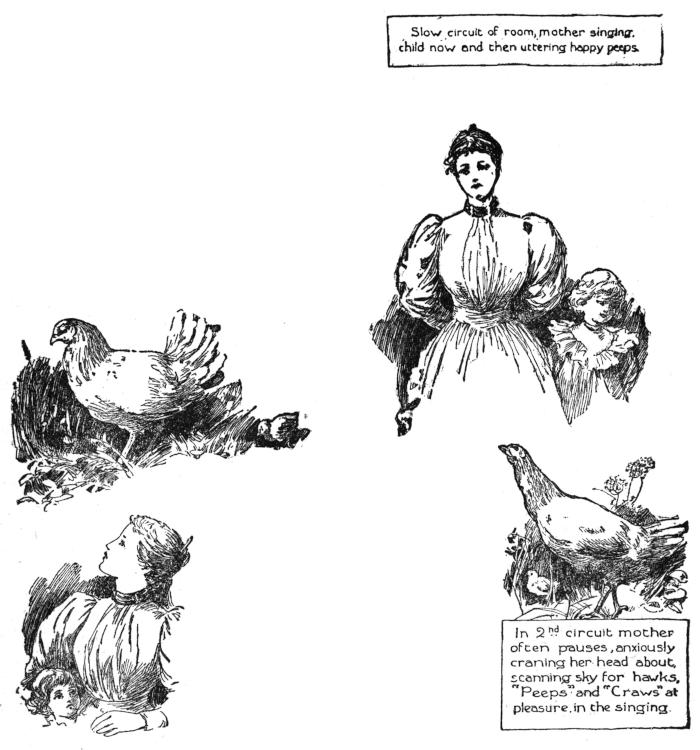 Slow circuit of room, mother singing, child now and then uttering happy peeps.