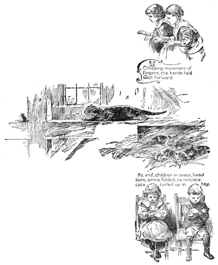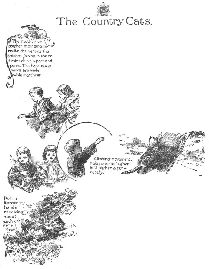 The mother or teacher may sing or recite the verses, the children joining in the refrains of pit-a-pats and purrs. The hand movements are made while marching.