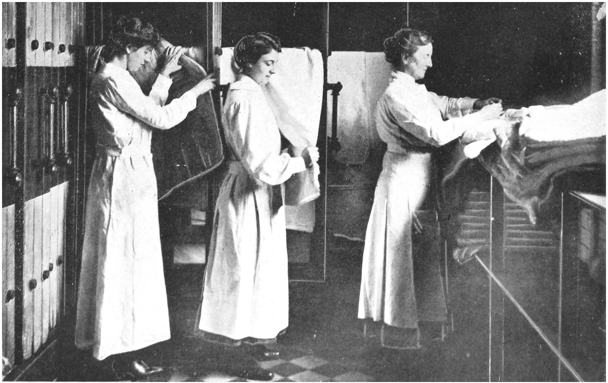 During the vacation, students from the London School of Medicine for Women came in large numbers to work in the wards and laboratories and operating theatre. Teachers from the women’s colleges at Oxford and Cambridge and from girls’ schools gave up a month or a fortnight of their hard-earned rest to relieve the hospital orderlies. Older girls came by tens from Roedean School for girls to take up administrative or clerical work or to be general duties orderlies. Wycombe Abbey sent its contingent, and friends and251 younger sisters volunteered to help also. The scheme was a great success: the regular orderlies appreciated the good holiday and came back better for it, and the substitutes enjoyed the novelty of the work and surroundings, and learnt much that was useful to themselves. Sunburnt, muscular schoolgirls appeared to find great pleasure in conveying stores and linen about the hospital, and their good spirits were a delightful asset. They took an interest too, in the personnel and customs of the hospital, and were wont to carry on conversations about them in loud tones, which were very amusing to those who could not help overhearing them.