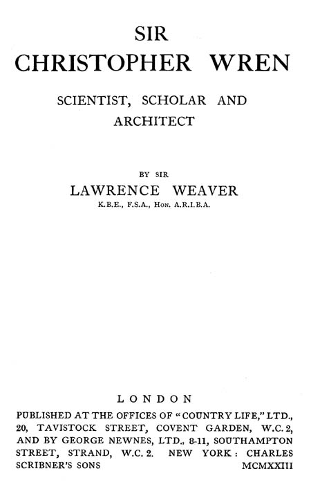 This little book pretends to be neither a Life of Wren nor a detailed record of his achievement. His working years were more than seventy. At fifteen the inventor of a weather-clock and the author of a Theory of Trigonometry which delighted Sir Charles Scarborough, he died in his ninety-first year, not indeed in professional harness, but still working at the multitudinous problems to which his life had been devoted.