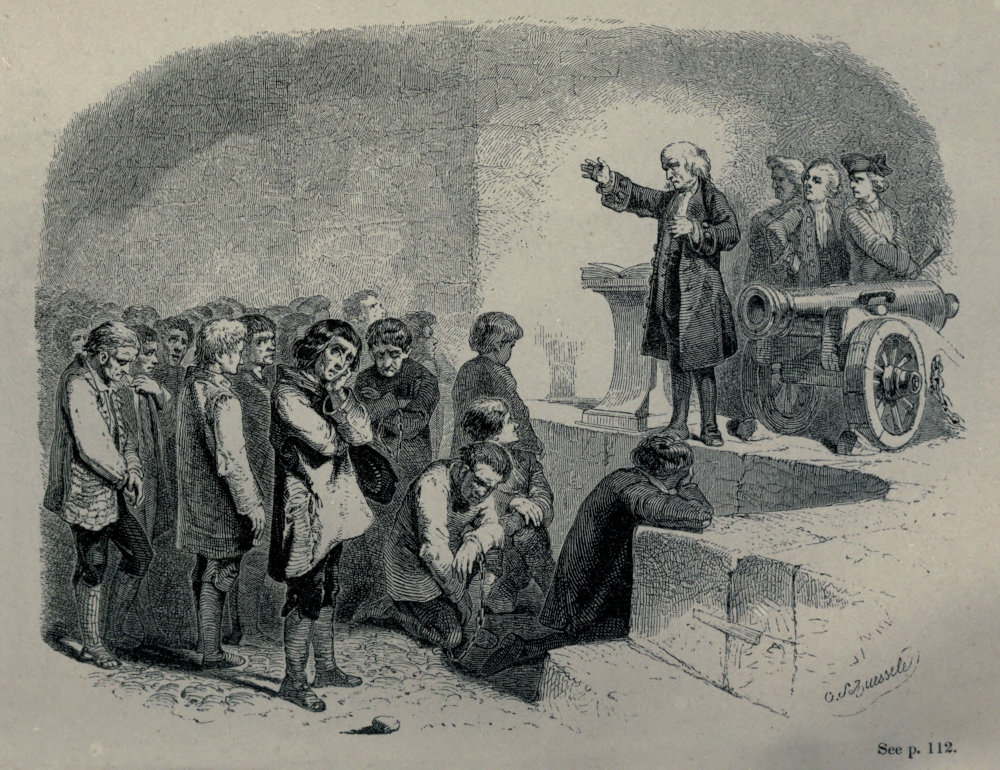 “At the appointed time the clergyman[1] repaired to the prison, and was received with a reserve bordering on incivility. The keeper reluctantly admitted him through the iron gate to a platform at the top of the steps leading to the yard, where a loaded cannon was placed, and a man beside it with a lighted match! The motley concourse of prisoners were arranged in a solid column extending to the greatest distance which the hall could allow, and in front of the instrument prepared for their destruction in the event of the least commotion.”