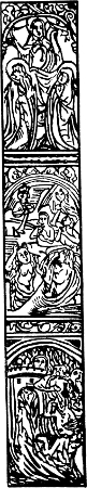 The first printers naturally turned to these manuscripts, not only for the models of their types, but for other hints—and what did they find? They found that the scribes generally began on the second leaf of the vellum or paper, and that sometimes the vellum or paper was ruled with faint red lines for margins and for evenness of line. They found that the title of the work was put at the head of the text, and that the first page of the text was enclosed within a richly illuminated border, sometimes merely decorative or conventional, but more often consisting of exquisitely drawn and coloured pictures,[4] illustrating, if it were a service book, scenes in the life of Our Lord or fragments of sacred history.