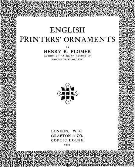 In the following pages an attempt has been made to give an outline history of the introduction of ornaments into books printed by English printers and the subsequent growth and development of the art down to the present day.