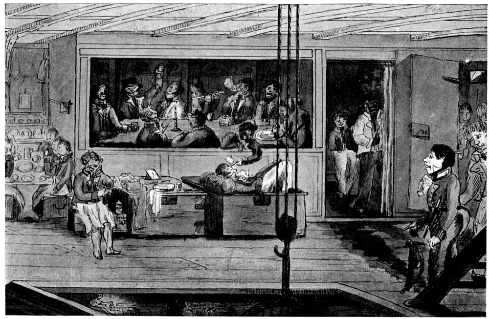 Below the lower or first deck was a sort of “temporary deck,” not wholly planked over, called the orlop or overlap-deck. It was practically below the water-line when the ship’s guns and stores were aboard. It was therefore very dark and gloomy, being only lit by a few small scuttles, in the ship’s sides, and by lanterns and candles (or “purser’s glims”) in tin sconces. Right aft on this deck was the after cockpit, where the senior midshipmen, master’s mates, and surgeon’s mates, were berthed. This cockpit was of considerable size, for here, after an action, the wounded were[Pg 27] brought, to suffer amputation and to have their wounds dressed. The mess table, at which the reefers and mates made merry, was fixed in the middle of the berth. After an action it was used as an operation table by the surgeons. Adjoining the after cockpit were cabins for the junior lieutenants; state-rooms for the surgeon, purser, and captain’s steward; the ship’s dispensary; a little cupboard for bottles and splints, and the purser’s store-room. In small ships of the fifth and sixth rates the marines berthed on this deck, abreast of the main-mast, hanging the beams with their pipeclayed belts and cartridge boxes. The spirit-room, about which the imaginative writer has written so imaginatively, was sometimes placed on this deck, near the after cockpit. More generally it was below, in the after hold.