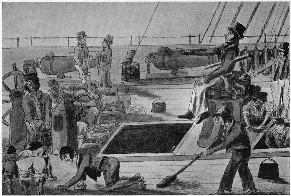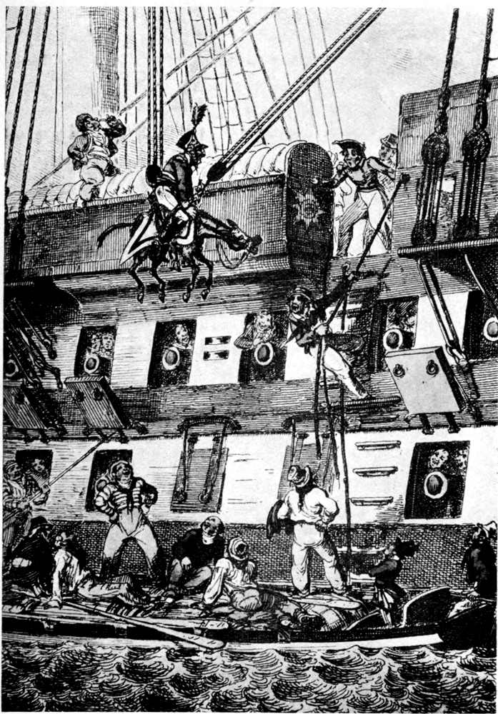 Some of the drawings reproduced as illustrations to my text are of a slightly later date than the battle of Trafalgar. I have included the three drawings by Captain Marryat (which date, I suppose, between 1809 and 1820), because they are vivid and spirited. They are true to the life, if something out of drawing, and there are not many drawings extant which represent the sea life so accurately, and with so much humour.