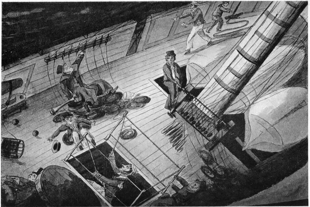 As a large portion of this deck was not decked over, but open to the sky, save for the boats and spare spars, the fighting space was comparatively light. In fine weather, and in moderately breezy weather, the gun ports on this tier could be kept open, at anyrate to leeward. In bad weather, when they were closed, when tarpaulins covered the hatchways and open spaces, the deck was lit by the bull’s-eyes—the round and oval[Pg 24] plates of thick glass, which were let into the centre of the port-lids. At night the only lights allowed were cased in the battle-lanterns of thick horn. If the ship went into action at night the sailors fought their guns by the light these lanterns afforded, one lantern being placed beside each gun.