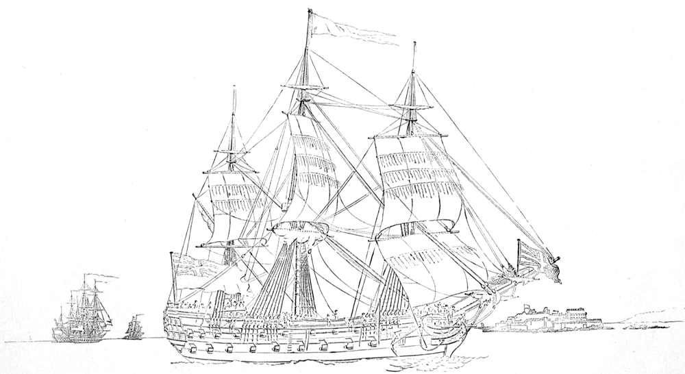 If one had taken a boat and rowed out to such a ship as she lay at anchor, fitted for the sea, towards the end of the eighteenth century, one would have been struck, first of all, by her bulk. The ships had bulging wooden sides, vast stern-works, and cumbrous wooden beakheads. They set one wondering how oak of such thickness could have been wrought to such curves. Till Nelson’s time there was no uniformity in the painting of the exteriors of the ships. The captains used their own discretion, and followed their own tastes, in the selection and application of the colours. The most[Pg 13] general colour-scheme was as follows:—Along the water-line, just above the ruddy gleam of the copper-sheathing, was a wide black streak, running right round the ship, and reaching as high as the level of the lower gun-deck. Above this the sides were yellow, of a yellow sometimes inclining to brown, like the colour of certain varnishes, and sometimes of a brighter tint, like the colour of lemon peel. The after upper-works above the gun-decks, and the outer sides of the poops above the quarter-deck guns, were painted a vivid red or blue. This band of bright colour gradually faded, till by the time of Trafalgar it had become a very deep and dull blue, of a dingy tint that was very nearly black. A band of scarlet or pale blue, edged with gold, ran round the forecastle, and continued down the beak to the figurehead. The outsides of the port-lids were of the same colour as the sides—that is, of a brownish yellow. The stern-works were generally elaborate with gilded carving, gilt cherubs, and the like, and with red, blue, green and gold devices, such as cornucopias, drums and banners, royal arms, wreaths, etc. Round the stern of each ship, outside the glazed cabin windows (we are talking of a third-rate or 74-gun ship), ran a quarter gallery or stern walk, on which the captain could take his pleasure. The supports and rails of this walk were heavy with gold-leaf. First and second-rate ships had three and two stern walks respectively. At the bows, at the extremity of the great beakhead, was the ship’s figurehead, either a ramping red lion[Pg 14] or a plain white bust, or a shield, or some allegorical figure suggested by the name of the ship. The allegorical figure was, perhaps, the most popular among the sailors. They took great pride in keeping it in good repair, with bright gilt on its spear or helmet, red paint upon its cheeks, and pretty blue sashes wherever such appeared necessary.