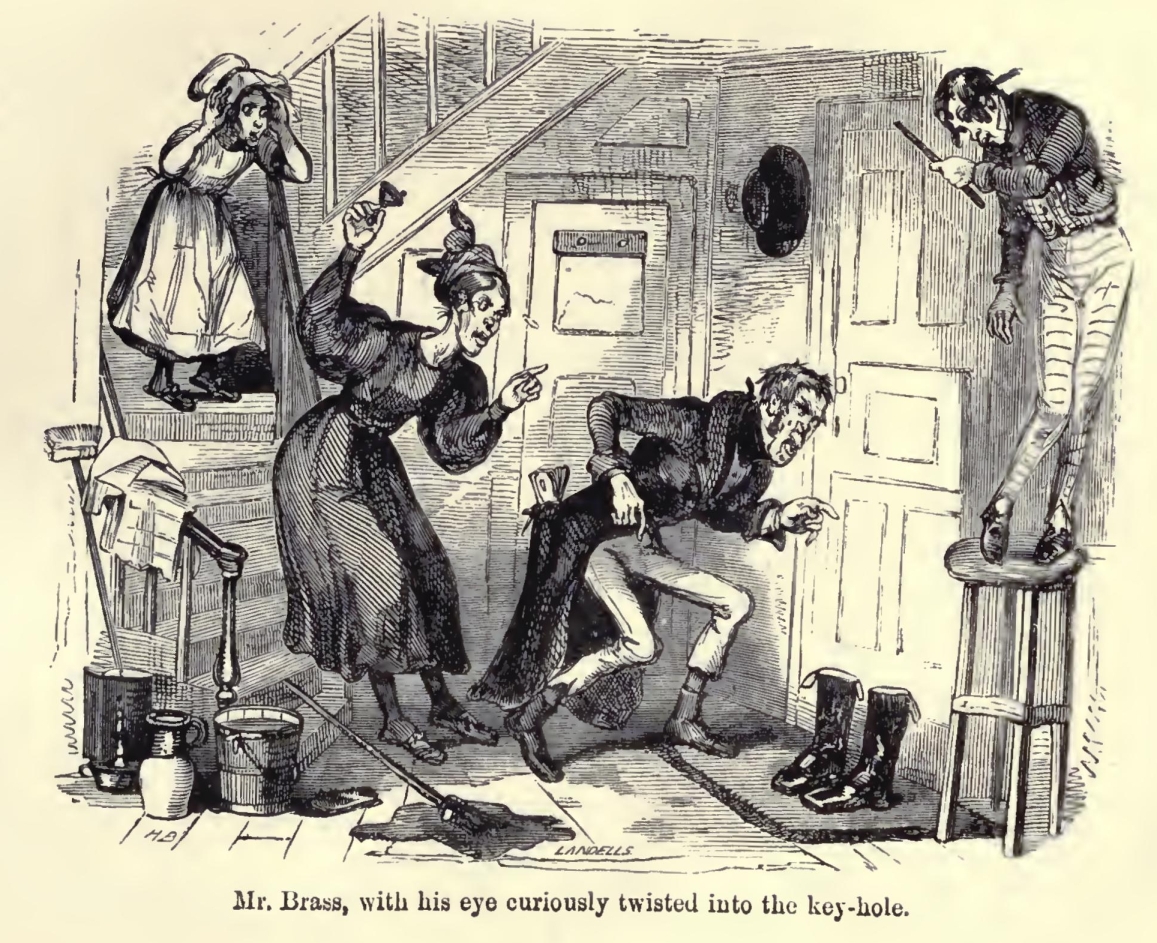 Kit was a shock-headed, shambling, awkward lad with an uncommonly wide mouth, very red cheeks, a turned-up nose, and certainly the most comical expression of face I ever saw. He stopped short at the door on seeing a stranger, twirled in his hand a perfectly round old hat without any vestige of a brim, and resting himself now on one leg and now on the other and changing them constantly, stood in the doorway, looking into the parlour with the most extraordinary leer I ever beheld. I entertained a grateful feeling towards the boy from that minute, for I felt that he was the comedy of the child's life.