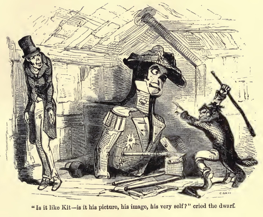 The lad had a remarkable manner of standing sideways as he spoke, and thrusting his head forward over his shoulder, as if he could not get at his voice without that accompanying action. I think he would have amused one anywhere, but the child's exquisite enjoyment of his oddity, and the relief it was to find that there was something she associated with merriment in a place that appeared so unsuited to her, were quite irresistible. It was a great point too that Kit himself was flattered by the sensation he created, and after several efforts to preserve his gravity, burst into a loud roar, and so stood with his mouth wide open and his eyes nearly shut, laughing violently.
