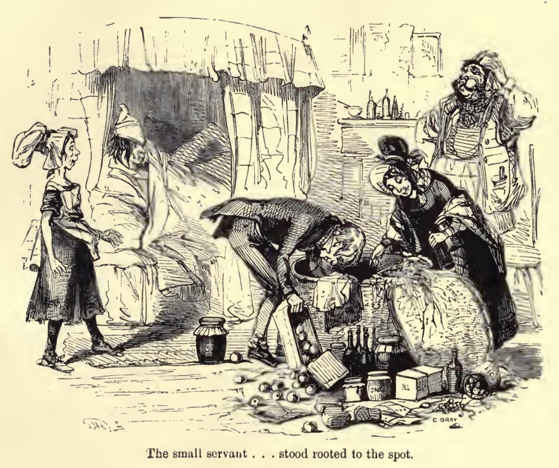 A part of this door was of glass unprotected by any shutter, which I did not observe at first, for all was very dark and silent within, and I was anxious (as indeed the child was also) for an answer to our summons. When she had knocked twice or thrice there was a noise as if some person were moving inside, and at length a faint light appeared through the glass which, as it approached very slowly, the bearer having to make his way through a great many scattered articles, enabled me to see both what kind of person it was who advanced and what kind of place it was through which he came.