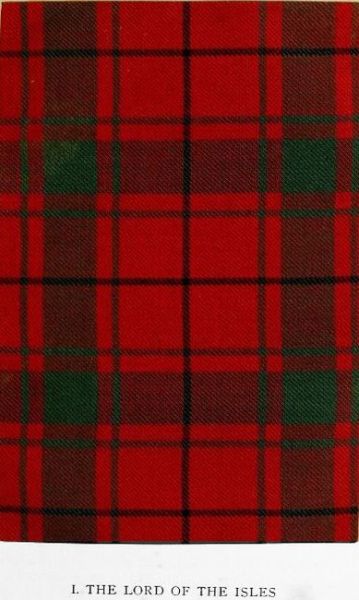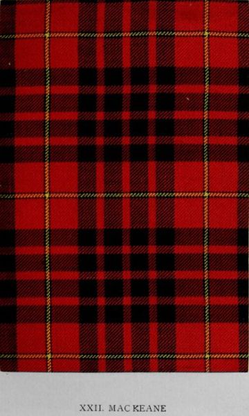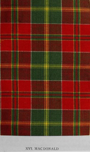 The Vestiarium Scoticum, already acknowledged as the earliest and the most elaborate illustrated publication on tartan designs, was edited by the late John Sobieski Stuart from a MS. stated to belong to the sixteenth century. The MS. was printed and published in 1842, with plates executed from drawings by Charles Edward Stuart, the editor’s brother. Of course the drawings are but a development of the descriptions in the MS. It need scarcely be added that the volume is now rare and costly. The MS. was transcribed and illuminated in 1829 by Sir Thomas Dick Lauder, for whom Charles Edward Stuart prepared a series of drawings which included several tartans not illustrated in the published work. One of these is here reproduced, and Sir Richard Urquhart, Knycht, the reputed author of the MS., thus describes it: “Mackeane hethe four stryppes of Blak upon ain scarlett feilde, and upon the scarlett sett ain spraig (sprainge) of yellowe of saxteen threidis, havand thereto ain bordure of Blak of twa threidis.” The Mac Ians, whose name is variously spelt in the early clan rolls and elsewhere as M’Kane, Mac Coin, Mac Eoin, Clanayioun, &c., were a branch of the Clan Macdonald. That the use of the design was not confined to this branch is evidenced by a contemporary portrait of Alastair Ruadh of Glengarry (who was prominent in the ’45), in which he is depicted in this tartan. The painting is in the possession of John Alastair Erskine Cuninghame, Esq. of Balgownie, Perthshire, the last lineal descendant and heir-general of Alastair Ronaldson Macdonell of Glengarry.
