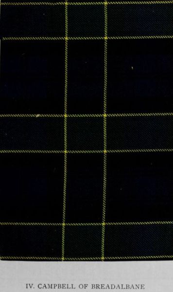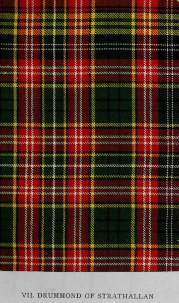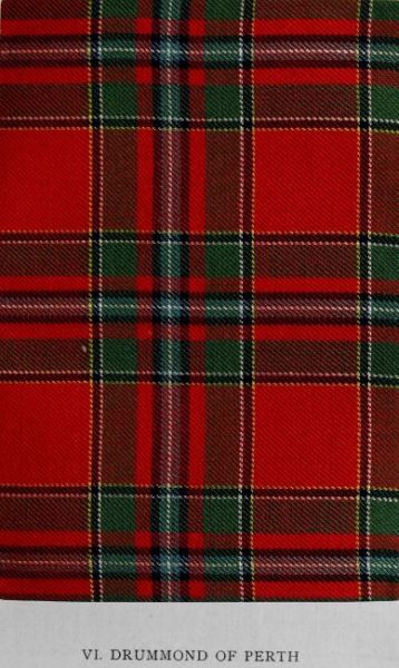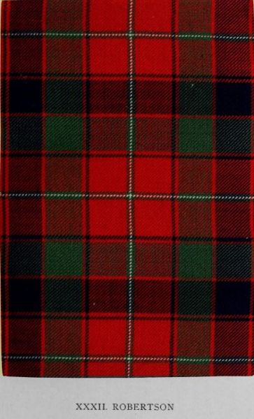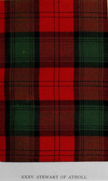 Five tartans described in the MS. whence the Vestiarium Scoticum was derived are omitted from that work. The illuminated transcript of the document by Sir Thomas Dick Lauder and the drawings of designs by Charles Edward Stuart, brother of the editor of the Vestiarium, were kindly placed at the disposal of the Editor by Miss Dick Lauder. In the Introduction will be found a lengthened reference to this work, while some notes regarding it also appear in the list of works hitherto published on the subject of tartans. It is believed that the reproduction of these patterns will prove of interest; and, accordingly, they are illustrated in Plates XXII. and XXXIV. to XXXVII. of the present volume. The Vestiarium is enough of a bibliographical rarity to be known to comparatively few, while the original MS. is meanwhile quite unavailable. The scheme here represented bears considerable resemblance to certain early setts of Royal Stewart, but no record yet discovered indicates the period of its general use in Atholl. There is reason to believe, however, that it constituted the basis of the red tartan of Clan Donnachie or the Robertsons. The well-nigh universal adoption of the Atholl district pattern (commonly styled the Atholl-Murray) by the various septs in this part of Perthshire precluded the extensive wear of any other. Hence this design has remained almost unknown to the present generation.