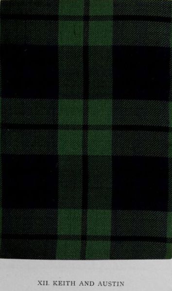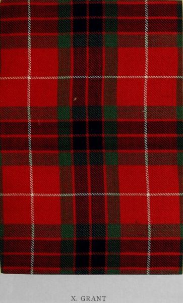 The extensive variations in the tartans styled Mackintosh are attributable to the fact that Clan Chattan embraced many septs, more or less nearly allied, who changed the pattern at will. But the chief’s and the clan designs are now accepted as authoritative examples of the early scheme. To the example here illustrated peculiar interest attaches, since it is the sett worn by Prince Charles Edward in the Mackintosh country. The Rev. A. Thomson Grant, of the Rectory, Leven, from whom the specimen was obtained, writes: “The piece of tartan I sent you was given me in September 1860 by Mrs Christina Mackintosh or Grant, widow of the Rev. James Grant, minister of Cromdale. I was at the time on a visit to Coulnakyle House, some miles above Grantown, where Mrs Grant and her family then resided. Mrs Grant produced a piece of tartan, which she confidently assured me was a piece of the kilt worn by Prince Charlie while in the Mackintosh country. The kilt, she added, was religiously divided among the then members of the chief’s family and near relations, and the piece she possessed had come down to her by regular descent from her ancestors of that time. When I was bidding good-bye, Mrs Grant halved the piece of tartan, and gave me that which is now in your possession.” The illustration reproduces the colours and the dimensions in the original, which, though a small, is yet a fine specimen of old hard tartan.