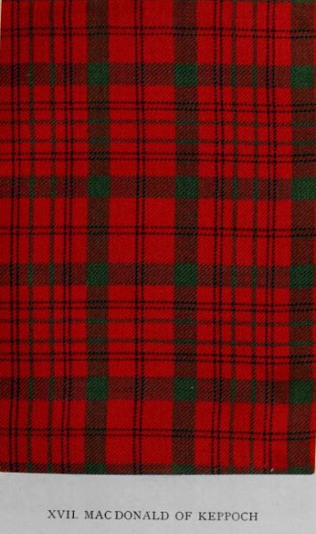 The Macdonalds boast more tartans than any other clan, in consequence of many branches having adopted setts differing from the clan pattern. The Macdonalds of Keppoch, or Siol Mac Mhic Raonuill, did so. This sept was not numerically strong as compared with others, for in 1745 its fighting men were estimated at three hundred. The illustration represents a portion of the plaid the Keppoch of ’45 gave Prince Charles Edward, long preserved at Moy Hall, but many years back divided among various families. Of this chief it is recorded that, when the Macdonalds refused to charge the Hanoverian army at Culloden, and stood irresolute, slashing the turf with their claymores, he exclaimed, “My God! Have the children of my tribe deserted me?” and dashed forward on the enemy, to be immediately shot down. Recently the pattern has fallen into desuetude, many entitled to wear it preferring the quieter colours of the pattern now commonly known as Clan Macdonald. Several variations of the Keppoch scheme exist, and old specimens differing from the illustration are held by some to be authentic setts; but this has always been admitted by leading authorities to be the Keppoch, since the plaid presented to the Prince was presumably in the chief’s pattern.