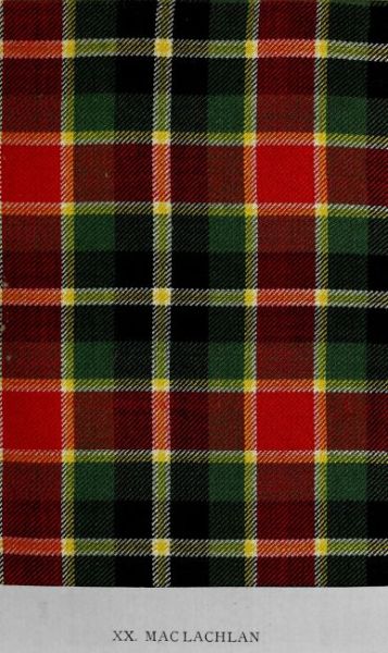 The accompanying tartan is one of two ancient designs bearing the same name. It figures in all the collections formed in the early years of the century, and an excellent example (the precise date of which, however, is unknown) has been procured from Messrs Romanes & Paterson. The other design, to be found in a collection made in 1790, is shown in an ancient piece of hard tartan with a simple check in red and green about five-eighths of an inch square in the Editor’s possession. In the Vestiarium Scoticum the Mac Lachlan is depicted as a brilliant combination of yellow and black, being the sett in use by the present Mac Lachlan of Mac Lachlan. The clan generally use a red and dark blue design, which cannot be traced further back than 1850 to the Smiths’ and Smibert’s works. The existence of the tartan illustrated appears to have been generally overlooked by the clan, a fact greatly to be regretted, as it is one of the finest of the old clan setts. That the illustration represents an early and authentic clan pattern of the Mac Lachlan cannot be doubted, for it is the only example occurring under that name in the collections of the Highland Society, the Campbells of Craignish, The Mackintosh of Mackintosh, and many others. Several members of a minor sept of the Mac Lachlans, followers of the Stewarts of Appin, were slain in the campaign of 1745-46 while fighting in the Appin Regiment. (See note under Stewart of Appin.)