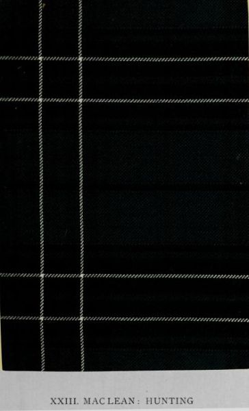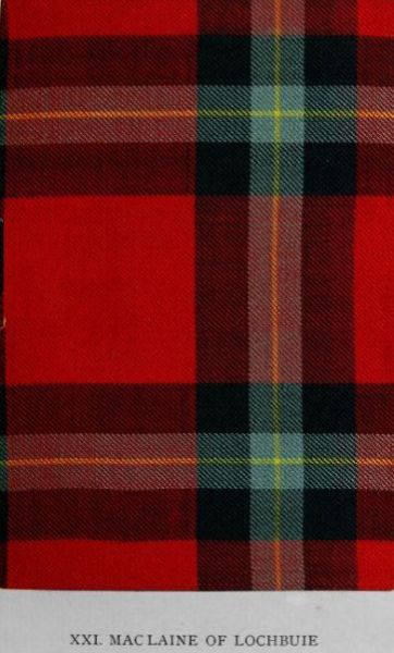 One of the few tartans concerning whose antiquity no doubt appears ever to have been suggested, the Mac Laine of Lochbuie ranks in every extensive collection of old patterns, though till recently it was not represented in any published work. Particularly fine examples are preserved in the Willis collection and in that of The Mackintosh. The design is generally woven in an open sett, which produces an admirable effect. It is unique among old patterns, by reason of the quantity of pale blue in its composition, that colour being usually reserved for narrow lines. The date of its introduction is unknown, but its use in the Western Isles last century is authenticated, and tradition points to its early origin. Despite the fact that the clan followed the Marquis of Montrose and joined the rising of ’15, it took no share in the ’45; and it may consequently be presumed that the members, like others in similar cases, continued to wear their tartan and dress after these had been formally proscribed. The present Mac Laine of Lochbuie wears also the hunting Mac Laine of Lochbuie, which, as he himself points out, is of modern invention.