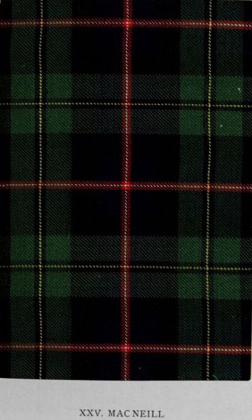 To establish the antiquity of this pattern of the Mac Neill it is but necessary to mention that it occurs in many old collections, including those of Craignish, Moy Hall, the Highland Society of London, and Messrs Romanes and Paterson. Several branches of the clan have other designs, but none is found in the ancient repositories either so early or so often as that now illustrated. A hitherto unnoticed reference to what is possibly the distinctive tartan of the Mac Neills appears in The Grameid: an Historic Poem descriptive of the Campaign of Viscount Dundee in 1689, by James Philip of Almerieclose, 1691, translated by the Rev. Alexander D. Murdoch, F.S.A. Scot., for the Scottish History Society, 1888. It reads: “The illustrious son of warlike Mac Neill comes from the winding shore of Barra’s isle, around whom, as their chief, a great company of the youth of his name presses on the right hand and on the left. Carrying his battle-axe, he advances on foot, panting as he goes, leading his tall clansmen, himself the tallest, and his shoulders covered with a Tyrian mantle. He displays as many colours woven into his plaid as the rainbow in the clouds shows in the sunlight.” Whether or not the tartan here presented was that worn by the chief in Dundee’s campaign cannot be determined, but, at least, it is the sole pattern associated with the name having any trace of red. The writer of the poem was a close observer, and many of his descriptions of dress and arms are highly valuable; while the allusion to “the winding shore of Barra’s isle” evinces an intimate knowledge of the peculiarly indented character of that island.