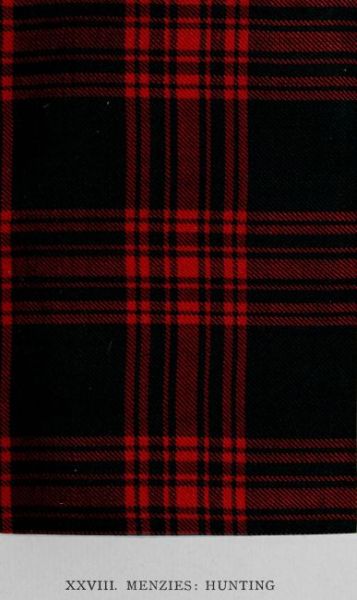 From early times the war-cry and motto of the Menzies clan has been “Geal ’us dearg a suas,” “Up with the red and white,” and this has been held to refer to the tartan; but, as other hues are found in old specimens, it is at least probable that both phrase and design may be traced to the heraldic shield of the chief, which is argent, a chief gules, the colours of the tartan as commonly known. In the hunting pattern here reproduced the only change is the substitution of green for red in the ground, and red for white in the stripes. The pattern of Menzies tartan, signed and sealed by the chief of that day, in the collection formed by the Highland Society of London in 1816-17, is an arrangement of red, green, blue, and white, and an example of last century date in the Editor’s collection is identical in sett. The use of the red and white Menzies tartan as a design for hose was common throughout the Highlands, as the ancient portraits of various families prove, and this use of the sett is probably of earlier date than its special adoption as the Clan Menzies wear.