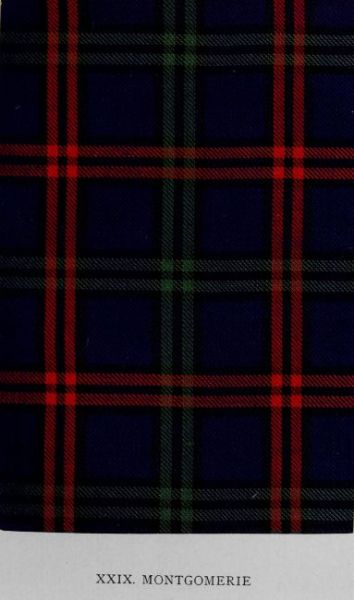 The frequent use of tartans by non-Highland families during a long period—certainly throughout the eighteenth century—has been noted elsewhere. It is not suggested that these wore the dress to the same extent as the inhabitants of the Western Highlands and Islands, but, nevertheless, the use of tartans was popular in the South of Scotland at the time of the Union of the Kingdoms, and for long afterwards. About this period, probably, the design here illustrated came to be adopted by the Montgomeries of Ayrshire. A fine example in old hard tartan, from Dr. Skene’s collection, has been employed as a guide in the reproduction of the sett. An examination of the historical relics in the possession of the Earl of Eglinton, the head of the Montgomerie family, at Eglinton Castle has furnished ample evidence of the early use of the tartan as here illustrated. In 1757 the Honourable Archibald Montgomerie, son of the Earl of Eglinton, received letters of service to raise a regiment in the North. It was known as Montgomerie’s Highlanders. The uniform, as appears from the Eglinton portraits examined by the author, consisted of the Highland dress, but the tartan worn was the Government or Black Watch sett, and not the Montgomerie pattern.